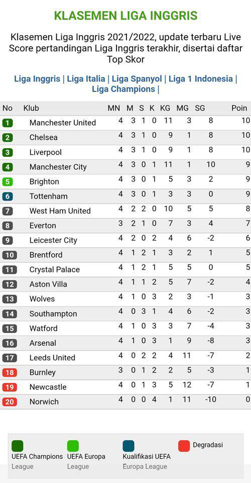 Update Klasemen Dan Top Skor Liga Inggris Man United Memimpin Arsenal Keluar Dari Juru Kunci Semua Halaman Kids