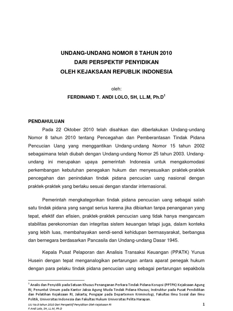 Undang Undang Republik Indonesia Nomor 8 Tahun 2010 Tentang Pencegahan Dan Pemberantasan Tindak Pidana Pencucian Uang Pdf Free Download