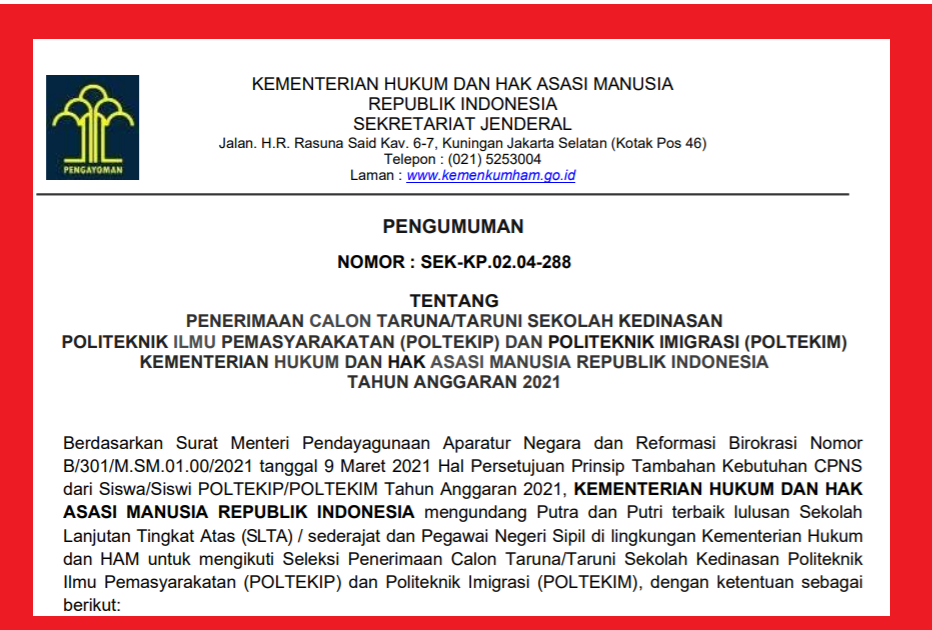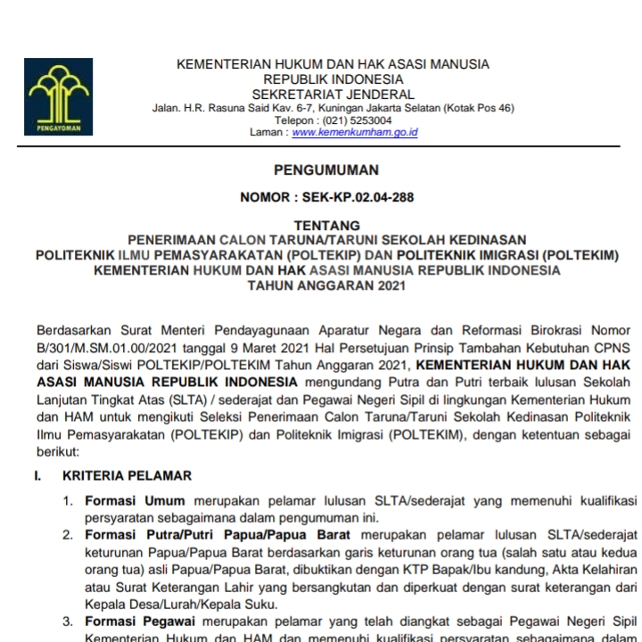 Penerimaan Calon Taruna Taruni Sekolah Kedinasan Poltekip Dan Poltekim Kemenkumham Ri Tahun Anggaran 2021