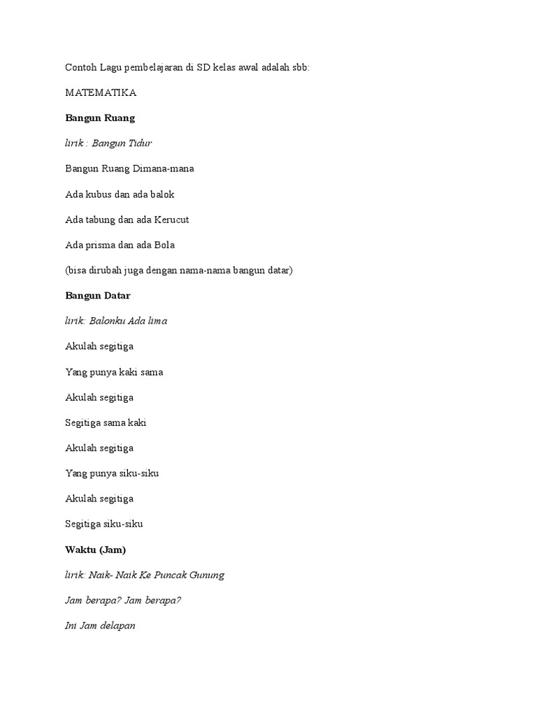 Contoh Lagu Pembelajaran Di Sd Kelas Awal Adalah Sbb Pdf